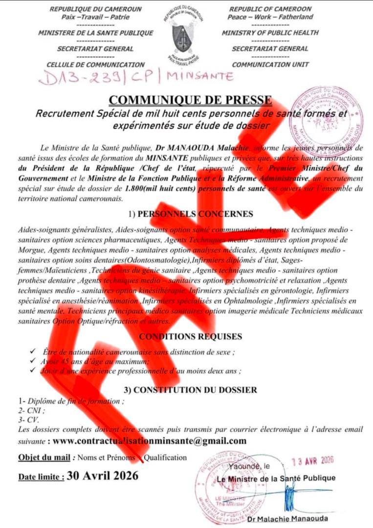 Dans ce faux document attribué au ministre de la Santé publique, le Dr Manaouda Malachie, il est question d’un recrutement sur étude de dossier, ouvert à plusieurs profils du secteur sanitaire, avec une date limite fixée au 30 avril 2026. Le texte mentionne également une adresse Gmail pour la soumission des candidatures, un détail qui a rapidement éveillé les soupçons.