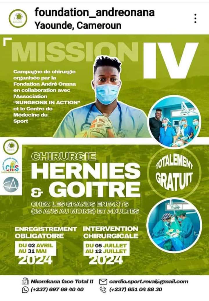 En collaboration avec l’Assocation « Surgeons in action » et le centre de médecine du sport, la Fondation André Onana organise du 5 au 12 juillet 2024, à Yaoundé, une campagne de chirurgie gratuite de la hernie et du goitre, chez les grands enfants (15 ans au moins) et adultes.