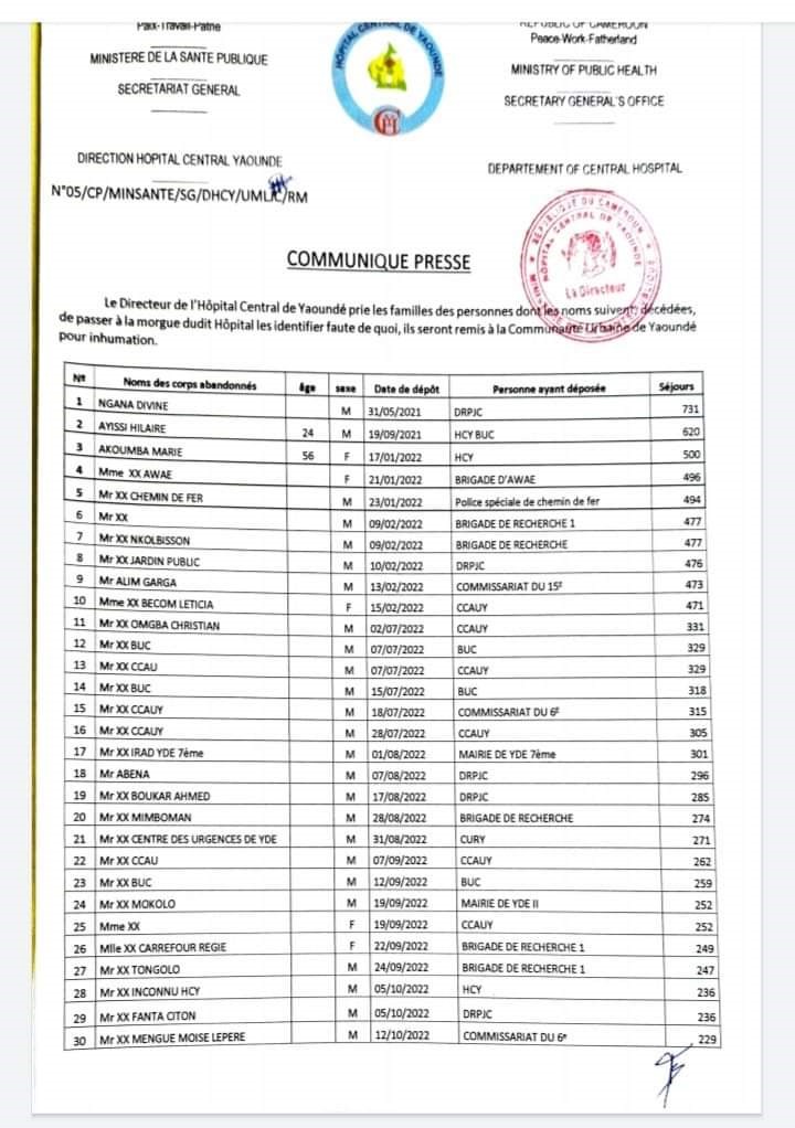 Un communiqué de presse signé du Pr  Pierre Joseph Fouda, le directeur de l’Hôpital central de Yaoundé, il prie ainsi les familles de passer récupérer ces corps « faute de quoi, ils seront remis à la Communauté urbaine de Yaoundé pour inhumation ».