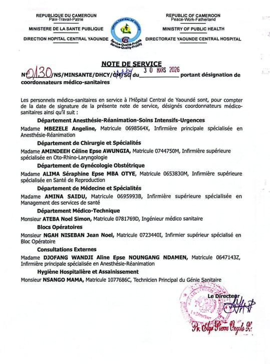 Le 30 mars 2026, le professeur Pierre Ongolo Zogo, directeur de l’Hôpital Central de Yaoundé, a signé une note de service portant désignation de huit coordonnateurs médico-sanitaires.