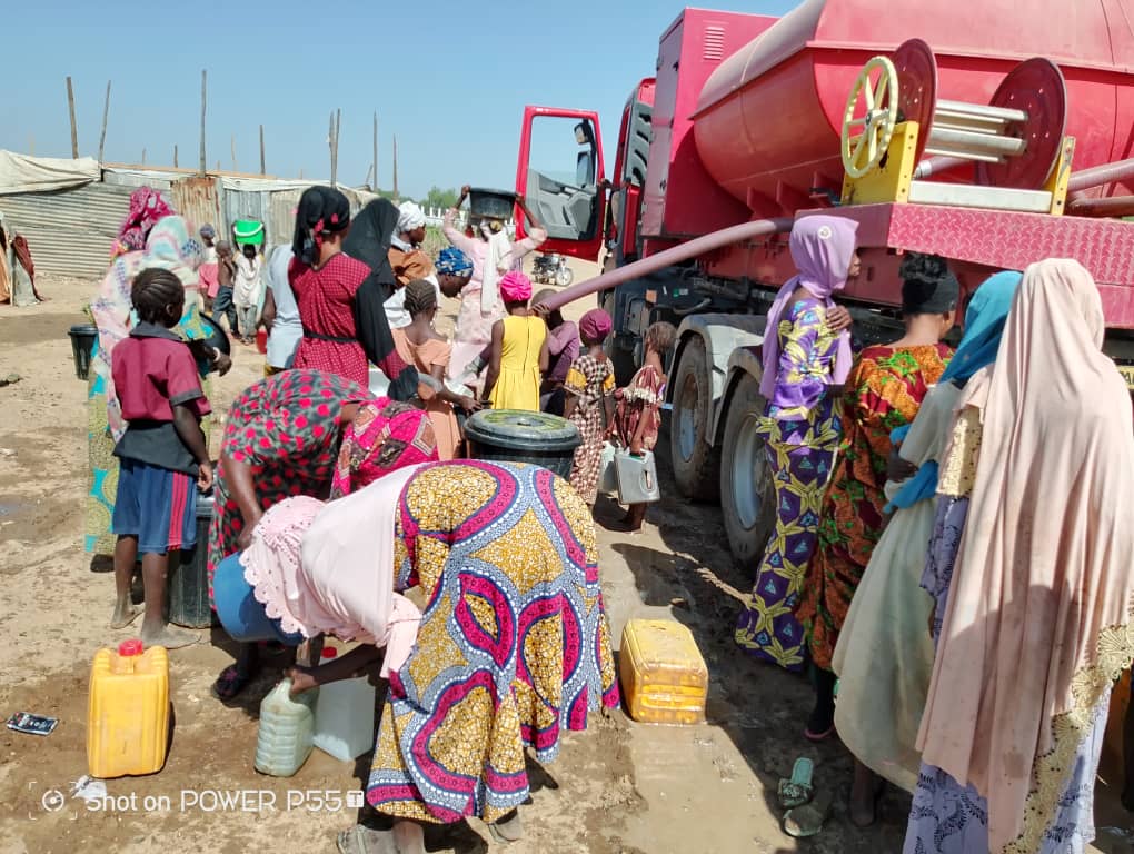 Les déplacés sont confrontés à un manque de ravitaillement en eau potable en quantité et qualité suffisantes. L’unique distribution d’eau est assurée par la 402ème compagnie d’incendie de Kousseri, mais la demande reste largement supérieure à l’offre. Les femmes et les enfants parcourent des longues distances pour obtenir cette précieuse ressource, mais les quelques forages ont parfois une qualité d’eau trop malpropres à la consommation.