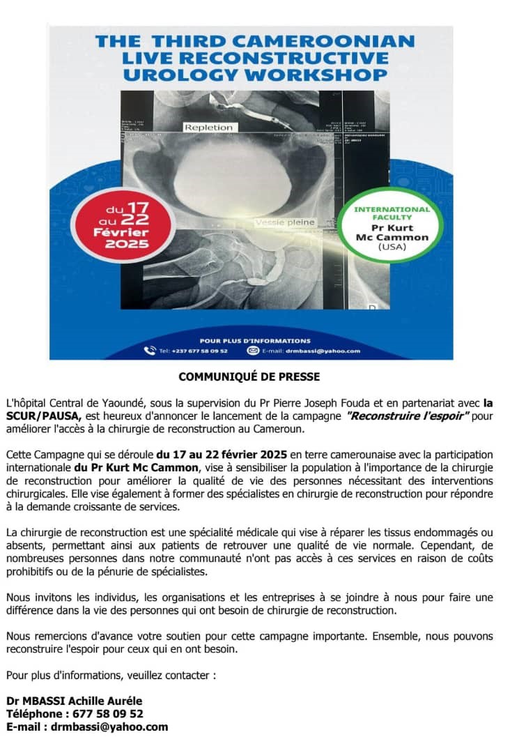 Du 17 au 22 février 2025, l’Hôpital Central de Yaoundé sera le théâtre de la troisième édition du Cameroonian Live Reconstructive Urology Workshop. Cette campagne, placée sous la supervision du Pr Pierre Joseph Fouda et organisée en partenariat avec la SCUR/PAUSA, vise à améliorer l’accès à la chirurgie reconstructive au Cameroun.