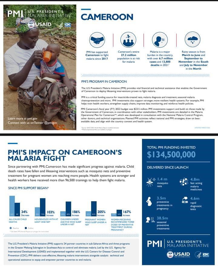 Depuis 2017, grâce à l’Initiative du président américain contre le paludisme (PMI), le Cameroun a déjà bénéficié d’un investissement à hauteur de 134 500 000 $ dans le cadre de la lutte contre le paludisme. Un investissement qui a notamment contribué à la baisse de plus de 35% des taux de mortalité infantile liés au paludisme. A l’occasion de la réunion de briefing des professionnels des médias sur la question, le plan d’action de PMI a été présenté par Aissata Fofana, Conseillère technique de PMI et Judith Hedje, Conseillère technique de CDC. Il en ressort que pour l’année en cours, PMI continuera à soutenir la plupart des activités mises en œuvre en 2022.
